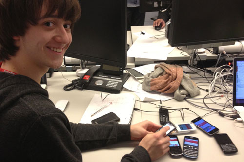 Coder James Lee tests his work on a Nokia C3 and other phones