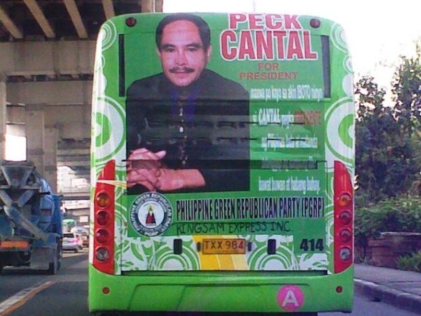 Filipino Philippino blogger Marocharim has an eye on the country's upcoming presidential elections in May. Here he's posted a snap of an ad for Felix "Peck" Cantal, a businessman who heads one of the green parties and who has an interesting campaign slogan . . . would that work where you are?