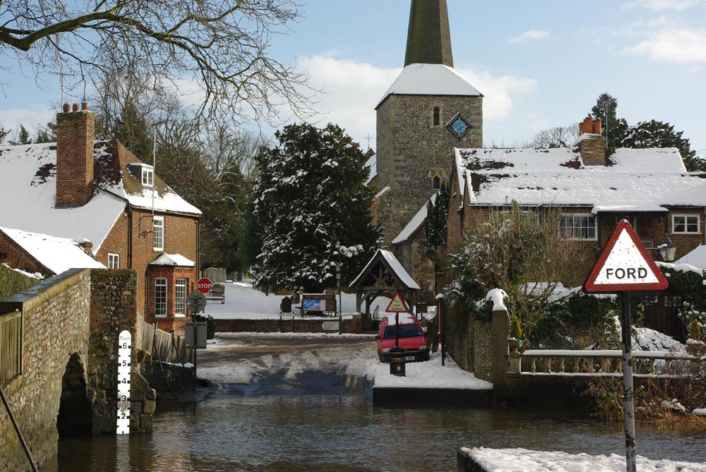 Running through Eynsford is the small River Darent which eventually flows into the River Thames. It's alive with fish, ducks and swans and in the Summer tourists pour into the village to sit by the river and paddle in it. It's possible to drive across the river too through a ford but sometimes the cars don't make it across and drivers need a helping hand to be pushed on to dry land!