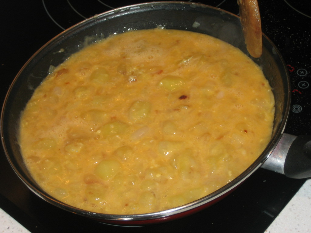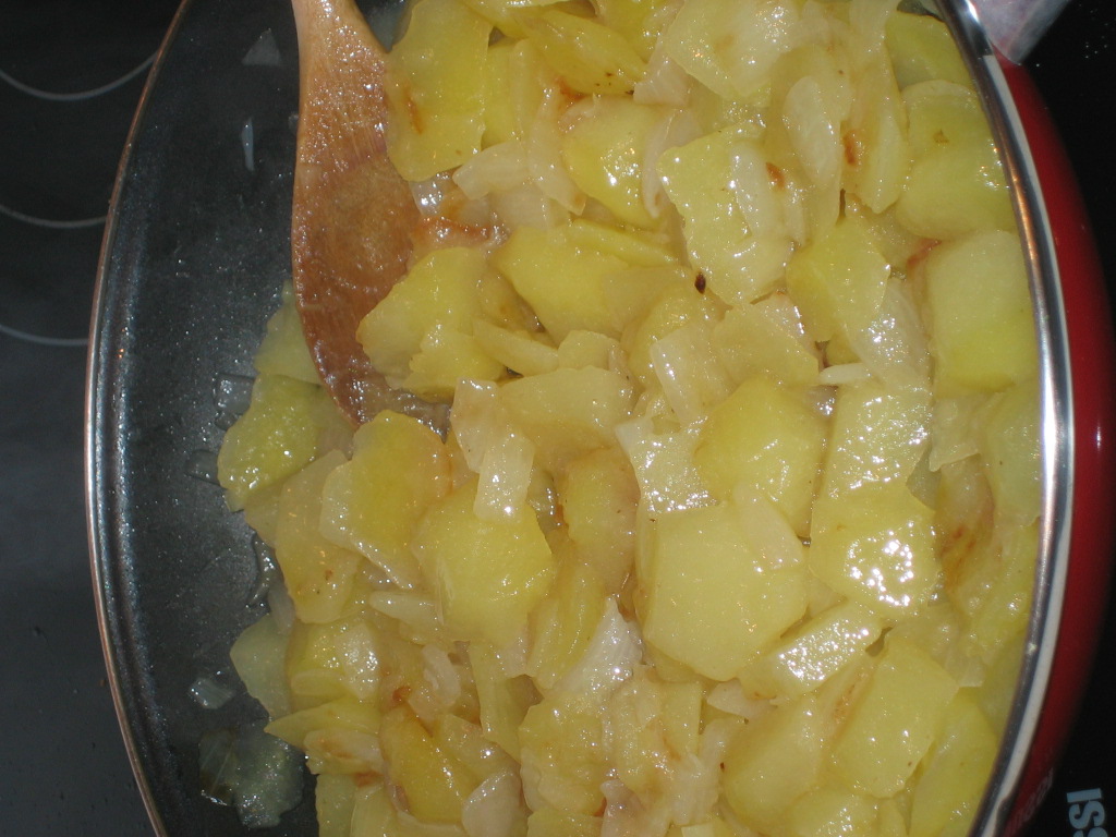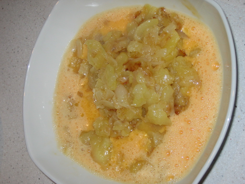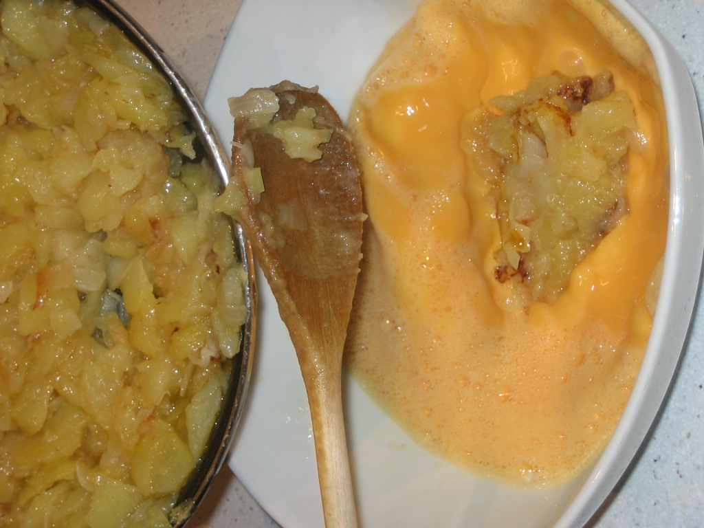 7. Mix the potatoes and onion cooked with the eggs.