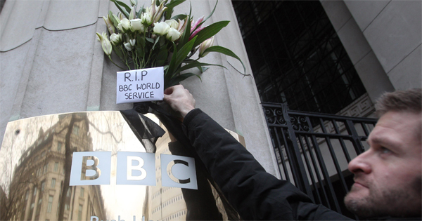 A BBC World Service employee leaves flowers for the "death" of the BBC World Service. Picture: Getty Images