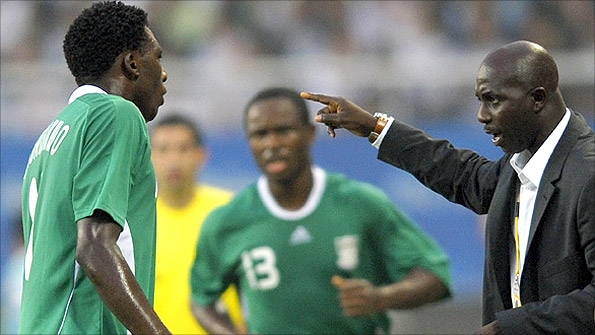New Nigeria coach Samson Siasia (right) advises his players en route to the 2008 Olympic Games final in Beijing