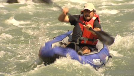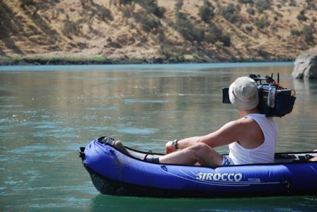 Moose, the cameraman, blithely jumped into an inflatable kayak with his camera.