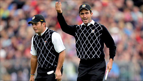 Colin Montgomerie takes up station behind the green. Sergio Garcia remains down the fairway. US assistant Paul Goydos is there too.