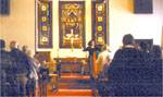Cyfarfyddodd Lluniau: Cymanfa Ganu'r gymdeithas gyda Mary Jane Davis Highfield, athro ac ieithegydd ym Mhrifysgol Albany, yn darllen o'r Ysgrythur a Darhon Rees-Rohrbacher yn arwain y gynulleidfa (uchod).