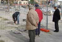 Gwelwn darfu ar eu hamdden a'r hen fois yn cyffroi o wylio gweithiwr ffordd yn ail osod rhan o'r palmant.