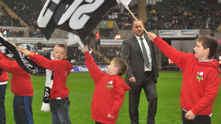Ymunodd cynrychiolwyr 40 o ysgolion Abertawe a'r Fro a chefnogwyr Stadiwm Liberty i groesawu Eisteddfod Genedlaethol yr Urdd i'r ardal yn ddiweddarach ac i weld yr Elyrch yn curo Crystal Palace 3-0.