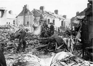 Rescue workers and Air-Raid Wardens hunt through the wreckage on a Hull housing estate following the detonation of a German parachute-mine.