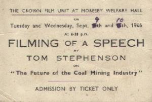 This part of the film was to listen to a speech by the Cumberland Miners' Agent at that time, Tom Stephenson, entitled "The Future of the Coal Mining Industry". Watching the film, it looks like the speech lasted for perhaps half an hour, but the film makers wanted to keep changing the position of the cameras to give different views, which is why the filming was spread out over two evenings. Joe and Tom Ritson can be seen on the film, sitting in the audience listening to Tom Stephenson's speech.