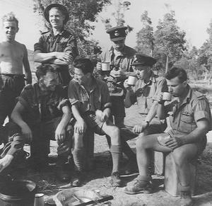 Aircrews of RAF Boston Squadrons eat a meal with the front line troops during their visit to Longstop Hill.