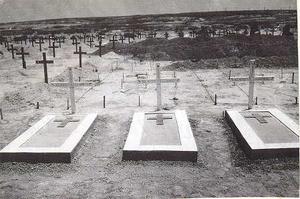 The three graves in the foreground are three Australians. Note the new graves on the left and the marked out plots awaiting the next burials on the right.