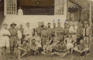 The officer told us which way to get to the coast and to keep a sharp look out for Japanese soldiers. By this time it was 15th Feb and Singapore had fallen. We did see some soldiers on a bamboo structured lookout on a tea plantation. I can only remember about 8 or 9 of us being together at this time with only 1 revolver between us. We sheltered in a small thicket until it was dark. We saw two Japanese coming up the path to the lookout. They passed so close I could have legged them down. When the guards had changed we waited until dark and then set off again. I do not know how it happenned but when it was light enough I found myself sitting on a large boulder in the countryside with no idea what to do. Again this is something that often comes back to me at night. A party of us (most of them on the photo below) got to the coast and managed to get a large rowing boat. We heard aircraft and soon found out they were japanese. Two of them started firing at us and cut the boat in two. I could not swim a stroke but Bill Routeledge managed to tie me to a bamboo structure in the sea the locals used to catch fish. At low tide they would come and empty the fish out.