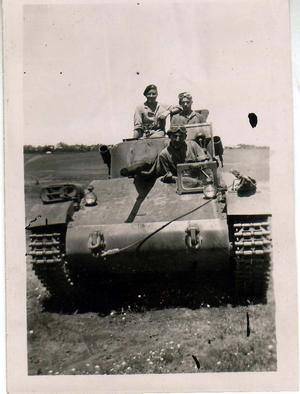 3rd The King’s Own Hussars Taking a ride over Rishon Plain, Palestine 1946. Trooper Lawrence (driver) Ronald Hornsey and Trooper Howard in turret.