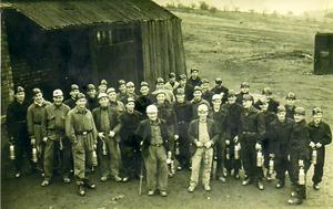 The Bevin Training camp era at Birley East Colliery and a group of trainees and instructurs pose for the camara near the lamp cabin at the eastern end of the pit yard.