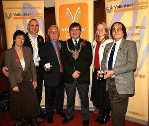 The Award Presentation at Sheffield Town Hall, 10th of November, 2005. Left to right are: Margaret Walker (BBC), Andy kershaw (BBC), Roger Marsh (Story Editor - Award Recipient), The Lord Mayor of Sheffield, Jo Thomas (Volunteer Co-ordinator) and Bill Ross (Story Editor - Award Recipient).