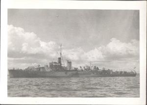 We became one of the escorts of the Fleet Train, a new concept in which 20 to 30 big storeships and oilers formed into a convoy which steamed towards Japan and remained at sea for months on end, for as long as their stores lasted, I suppose, or until they were relieved by fresh storeships. The fighting ships made forays towards Japan, then fell back on the convoy to replenish their supplies, being saved the long haul to the Philippines. I suppose it was a Yankee notion of efficiency maximised, but it meant long and wearing months at sea for everyone. We steamed two or three hundred miles north at a time, then turned and reversed the course every second day, varying it just enough to avoid being seen twice in the same place. We did this for three whole months on end, never getting within about a thousand miles of land in all that time! We were somewhere south of Japan when VE Day came, and I remember celebrating with the skipper on the midnight watch, the only time I ever had a drink at sea except as a rum-swilling rating.