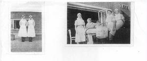 Photos: Oxted Hospital, 1940/41 Joyce Banks (L) and Nurse Gregory on the roof of the private patients' ward. Outside on the veranda of the children's ward, from left - Nurse Jones, two children, Joyce Banks, Nurse Gregory.