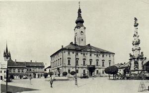 Politschka, Czecho-Slovakia. A view taken in the middle of the town showing Rathaus (Town Hall) and church that lies on the extreme left.