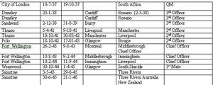 When Italy came into the war and closed the Mediterranean I was still on the Thurso, a very very happy ship still third mate. The Ministry of Transport took over and we were sent all over the place. One voyage we loaded coal for Kingston Jamaica. We got away out into the Atlantic and the steering gear broke in such a position, as there was not much we could do to repair it. The Mate was absolutely useless, but finally others took over and got things sorted out. We found that by adjusting the engine speed we could steer the ship, very crudely but we could steer the ship. We had been in convoy till we broke the steering gear, but then of course we left them. It was war time, we were on our own and one night we were just steaming along nicely and steadily and there was one hell of a ware came and the lifeboats, which had been strung out ready for launching in case of a torpedo. The weather one was pushed through the davits because the lifeboat was longer than the gap between the davits. There was not a bit of wood above 6 inches when it had finished. Water went down the engine room through the skylights the deckhouse racked the cargo shifted, we were in a hell of a state. The lee lifeboat filled with water and bent the davits we had to let that go so then we had no lifeboats. The old man Captain Maldine was a nice old gent but never a master of a ship. Anyway we never started the engines in the dark. As soon as daylight came we started the engines up and by adjusting the engine speed we could steer the ship. As soon as night came, which was very early then because don’t forget we were up near Greenland it must hare been November December time.