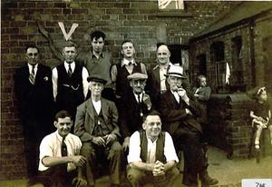 The men of Creswell Road. Back Row (L-R): Mr Headworth, Mr Newton, Frank Hamer, Mr Wignell, unknown man (a visitor). Seated (L-R): Mr Lewis, Mr Hibberd, Mr Hall. Front (L-R): Mr Bend and Mr Beeston.