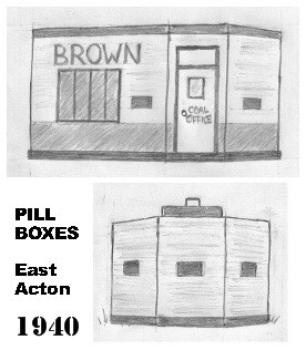 Postscript: Although they were hastily built many ‘pill boxes’, such as the one beside the railway line at ‘Wormwood Scrubs’, one at the entrance to a factory on Gunnersbury Avenue, another on the Great West Road, and also beside the District line at Acton Town, survived for almost sixty years.