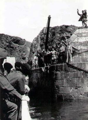 Tim Cavvé is pictured at the age of two years in his father’s arms how is stood on the top right of the photograph. They are greeting the first of the British troops who are liberating the Island of Sark at the end of World War 2. Sark was occupied on June 30, 1940 and was liberated May 10, 1945.