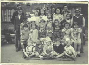 I only remember a few things about the war as a 5 year old at the end of the hostilities. I recall the house windows being blown in for the second time in a week. My father throwing me to the pavement and covering me with his body when a doodle bug fell silent and landing about a 100 ft away.Sitting under the table in the Morrison shelter listerning to bombs dropping. A large peice of shrapnel stuck in the class room ceiling. Waking up in the morning to find the house at the bottom of our back garden had disappeared. The VE party was wonderful we had never seen so much food and drink and every one happy. I have two photos of the festivities and would really like to know if any of the people in them are still around.