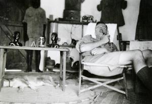 My Father, Bill Abbott, inside his little gida (hut), smoking his pipe.