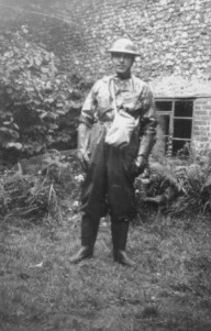 Often during the period of the war there were air raids. On one occasion fifteen bombs dropped into the field at the bottom of our garden. The R.A.F and Police came to sort them out. We had one of the first garden air-raid shelters built in the town of Wymondham. My mum, dad, Philip (my brother) and I would use it and so would grandma and my aunt who lived next door. The sirens would sound when the German planes approached the coast and we would then go down in the shelter for hours on end. We could often hear guns and see searchlights. I can remember very clearly my mother and aunt carrying tea on a tray down the steps of the air raid shelter and the cups clattering loudly. I was interested in what was happening, but not frightened. I was very fortunate since I never got involved with the nasty side of the war.