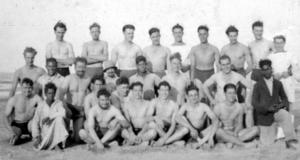John Darlington Bruce (back row, 2nd in from right) on shore leave at Sri Lanka in November 1944. He wrote on the back of this photograph “What a War!”.