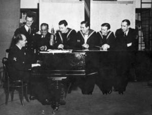 Evening entertainment became a deserving priority. This was made easier because the Central Depot had been a Town Council Amusement Park in peacetime and boasted a splendid Concert hall! No training Depot is without a Royal Marine Band for parade work, and in the evening as an orchestra they did wonders. The Navy knows a lot about making its own fun with Concert Parties. Add to that the fact that Dunkirk led to many men becoming eager to serve in the Navy, and we had many in our ranks who came from the world of entertainment in London. We put it all into good use and created a Dance Band called "The Royal Navy BLUE MARINERS.” They were the Royal Navy’s challenge to the Squadronaires and the Blue Mariners were celebrating the fact that they were composed of men who had played for the famous dance bands of London. Here are their names and the celebrated dance bands for whom they had played.