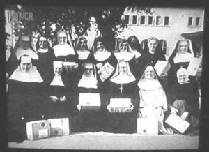 A group of German nuns and sisters who ran the domestic side of the camp. The camp was a religious cloister in which mental defectives were cared for before the war. I remember one poor wretch who had been locked up in a gloomy windowless cell for eleven years. We used to peer secretly through a peephole in the door and watch him pace his cell like a caged animal mumbling and burbling to himself. Other inmates were allowed to help in the kitchen or vegetable garden. One particular favourite of ours was a poor creature who used to lope around the camp shouting abuse at us children much to our glee. Most of the inmates had been moved to make way for the internees. Their fate may be imagined.