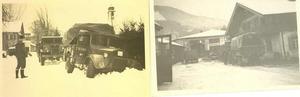 Soon it started to snow. Then a driving blizzard began. As we faced a long uphill climb, we decided to stop and put on our chains. Then we slithered to the top of the hill where we had a welcome break in an American canteen.