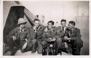 A merry group of mates Pete, Camp, Smudge, Ted, and Cliff in front of Jack Burgin’s tent on Christmas Day 1942.