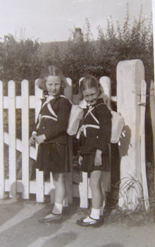 Audrey (left) and Shirley Lloyd as they waited to get on the bus taking them out of Southend in 1940. They wore skirts, blazers and little rucksacks made by their mother, a dressmaker.