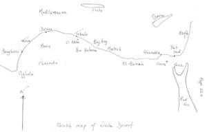 The night was cold, but this time I was better prepared with three pullovers and a greatcoat. Even with all this warm clothing, I didn't sleep much after three. At seven o'clock I got a grand hot cup of tea from the NAAFI car on the train. At ten we pulled into Tobruk, just 24 hours after leaving Cairo.
