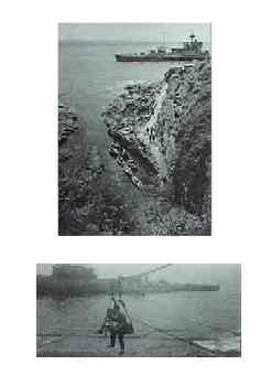When I was about five years of age my family went on annual holidays to Cliff Cottage, which looked right out on the Warspite as seen in the picture which was taken by my father from the cottage. My parents befriended the salvage men working on the ship, and we were invited over to look around. My mother and nanny got into the local papers as being the first women ever to set foot on the ship. Below you can see us going over on the breaches-boy.