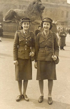 Sheila Fenn (right) with friend Gillian Sweeting (left) in Trafalgar Square in 1945 whilst stationed as drivers in Chelsea with the A.T.S.