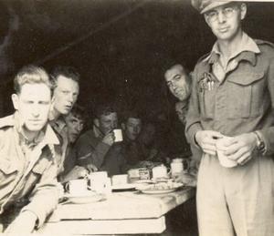 Christmas Dinner's were traditionally served by the Officers. Here dinner is being served by Captain Rice. Dinner was bully beef and boiled potatoes plus a glass of whiskey as a treat from the Captain.