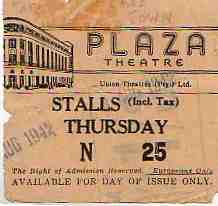 August 03, 1942 — Ticket for entry to the Plaza Cinema, Cape Town, South Africa. The cinema had a sliding roof, which opened completely in hot weather. The price was 1/3d that is 1 shilling and 3 pennies (now 6p). Note: the tickets were issued to Europeans Only.