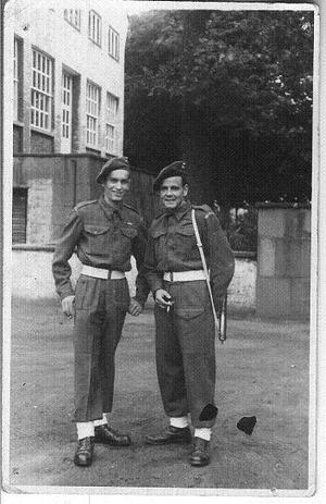 David Wrightwith his friend outside the Div Battle School in Dusseldorf after the war was over, 1946