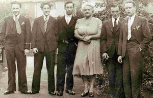 The picture is of a group of Bevin Boys, including my dad.They are pictured with the landlady at their lodgings, in the Crescent, Langwith Junction. From the right, Fred Norford (formerly a printer), Dad (Frank Mallett), standing next to the landlady, Mrs Waddingham. Les (from Cornwall), Don and then Roy Young (formerly a butcher from Rainham in Essex. After the war he married Dorothy Fletcher from Shirebrook, they eventually moved back to Essex).