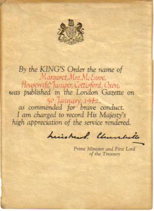 The tale was given some weight by the framed presence of a certificate, signed by Winston S. Churchill that commended my Mother - 'Margaret, Mrs. McEnroe, Housewife' for brave conduct.