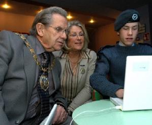Mayor and Mayoress Jim and Brenda Smith log on to BBC People's War website with Cpl Peter Thompson, 17, a member of Crawley 19th Sqdn ATC