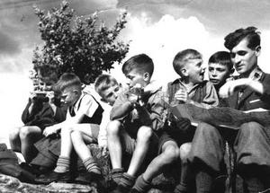 This picture of the boys with teacher was taken by a newspaper reporter on the occasion when our teacher, Ben Cluff took a group of us evacuees to Symonds Yat on a day out. I am second from the left