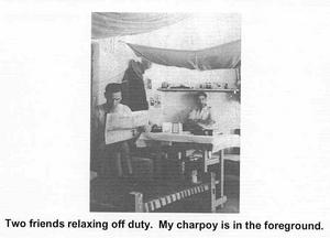 For administrative purposes we had one officer. He was told about this episode and that beds would have to be obtained from somewhere. He agreed we could do with something to lie on. He knew that charpoys, string beds, could be purchased in Dimapur. They would cost four Rupees (about 30p) each and if we agreed to purchase, he would send a lorry to collect them. Four Rupees was handed over by each of the men, coming to about 80 Rupees. An Indian driver was given the money and sent off. He left the lorry in the lorry park at Dimapur and was never seen again. We didn't get the charpoys and had to I continue sleeping on the floor.
