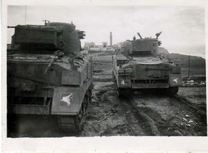 Mosque taken from the Fort Sidna-Ali with tanks in the foreground January 1946. Tanks of the 6th Airborne Armoured Reconnaissance Regiment guarding Sidna-Ali Police Fort after attack by terrorists