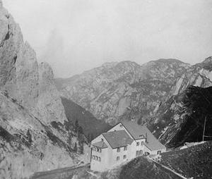 Another world... peacetime Italy, July 1935. In this mountain refuge, 7,000 feet up in the Dolomites, a group of friendly German climbers introduced me to Minna, the Danish girl who became my wife in 1937. In December 1945 I was returning to her.