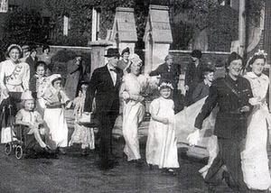 The 'mock wedding' Victory celebration by residents of St Catherine's Street, Gloucester.