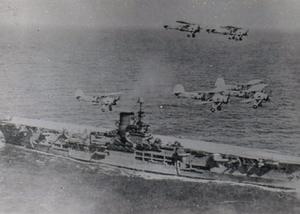 This photo shows HMS Formidable, an Aircraft Carrier of the Illustrious class surrounded by five Swordfish - Torpedo Spotter Reconnaissance biplanes